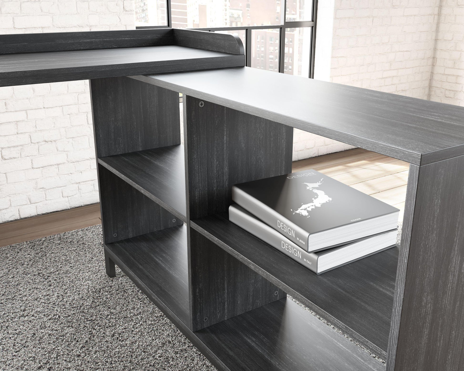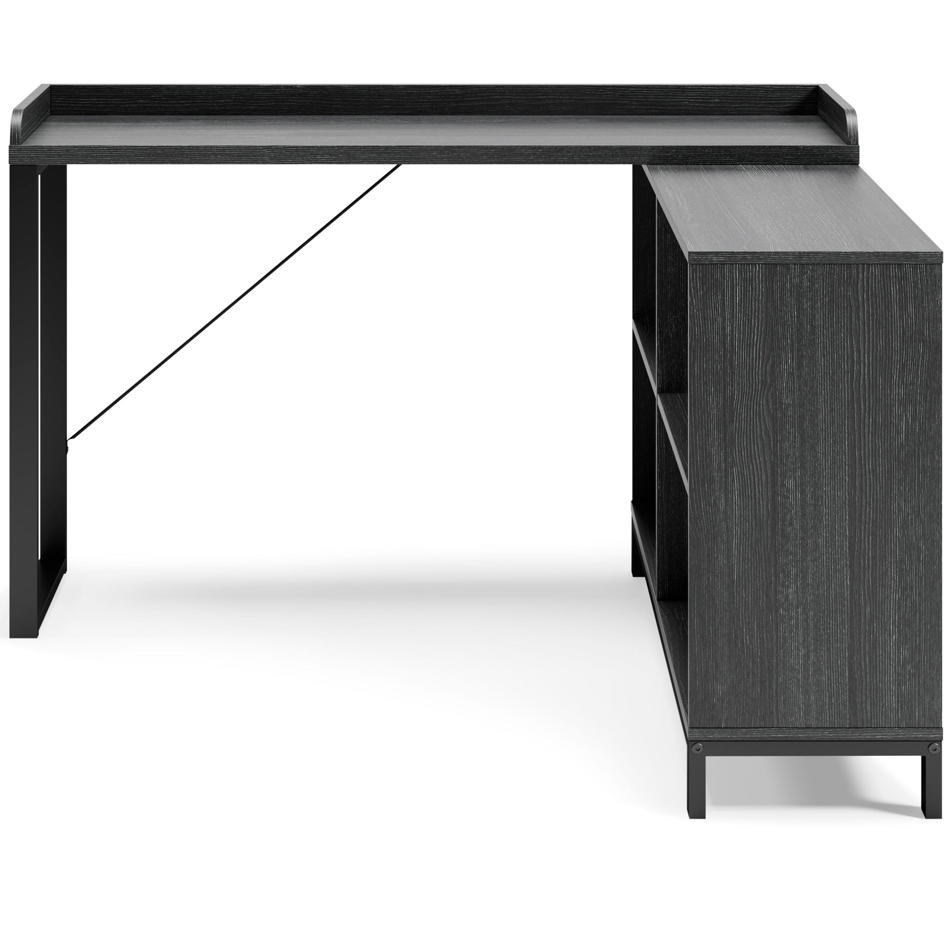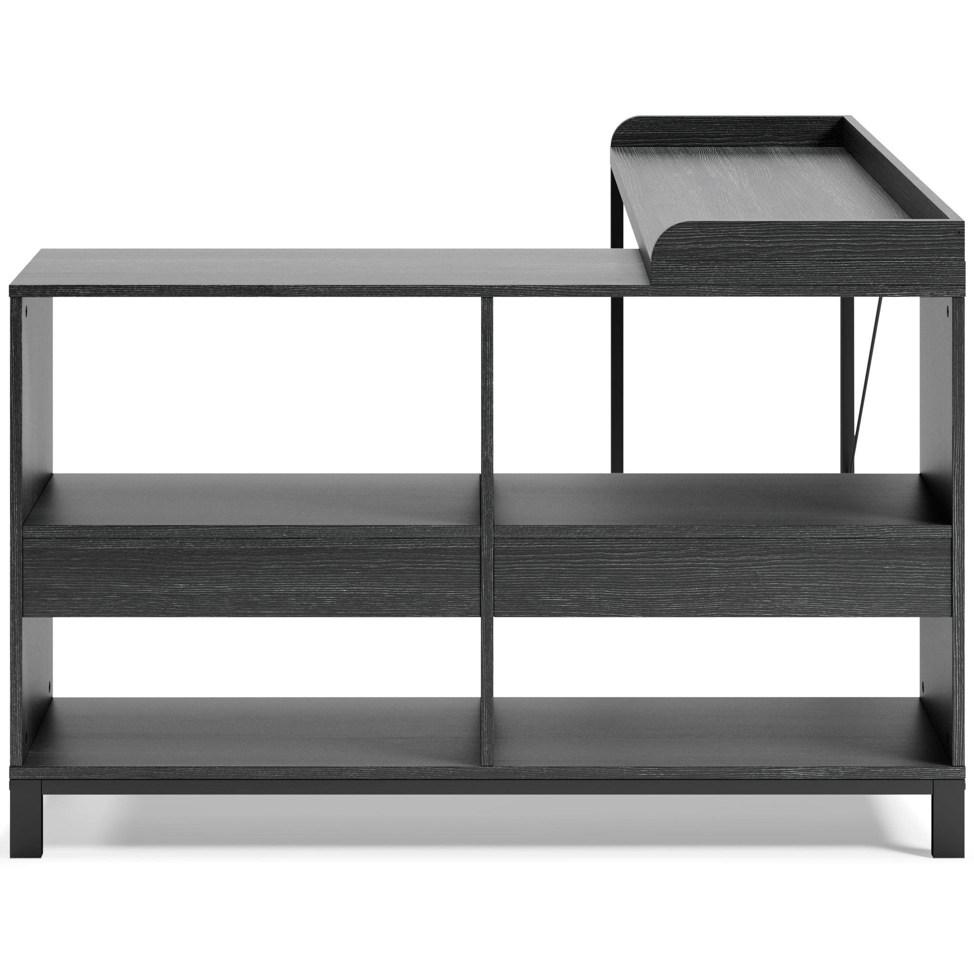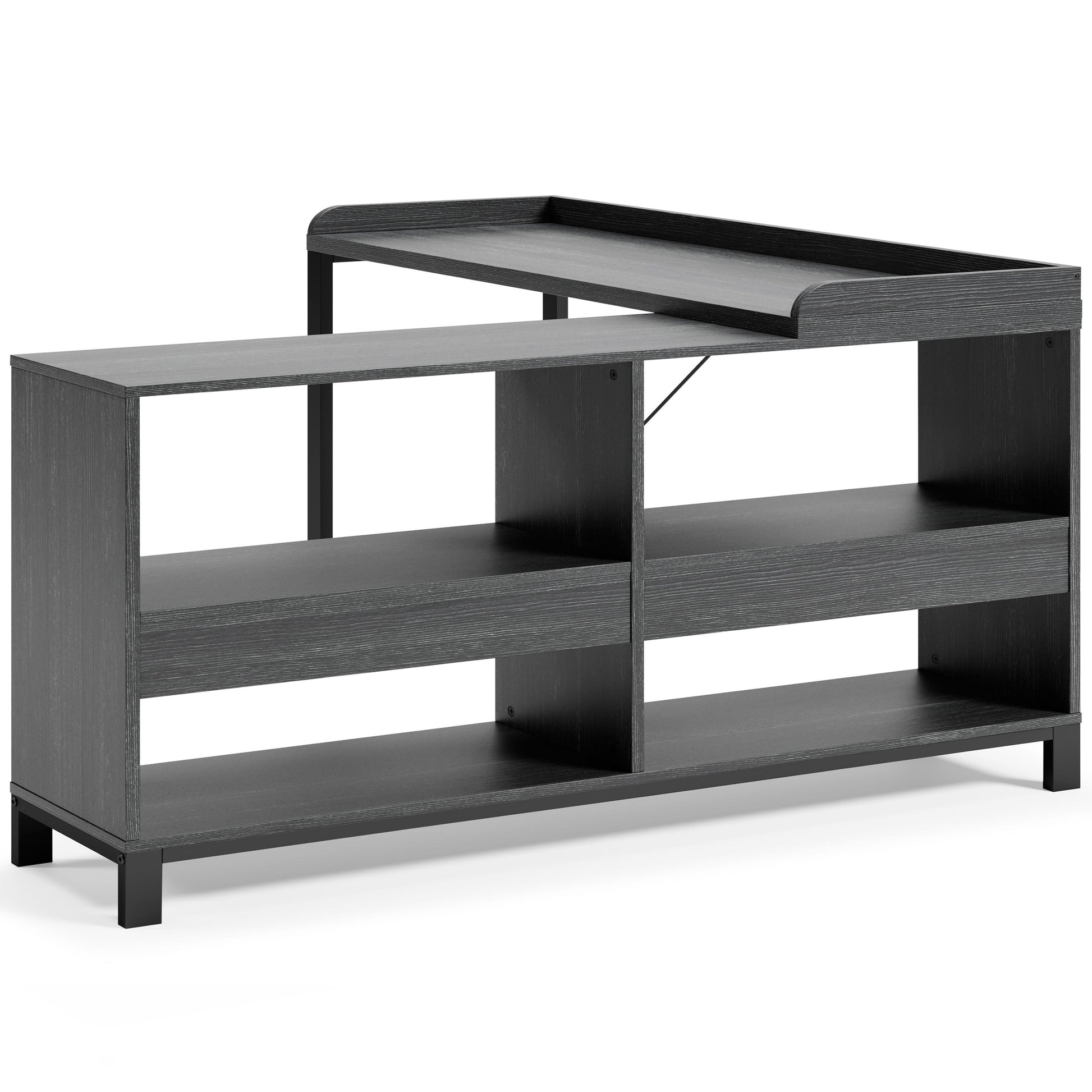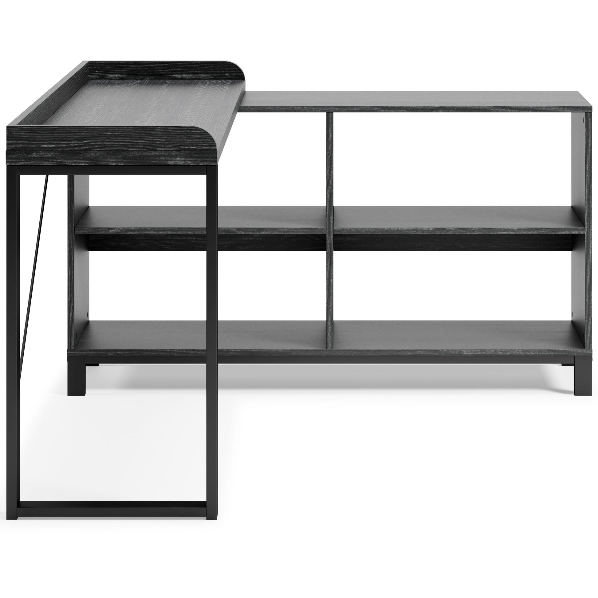 Elevate your home office with this simply sensational L-desk with an open bookcase. Pairing a dark wood grain look with a black metal frame for modern appeal, this minimalistic desk provides a convenient work surface with incorporated bookshelves for extra storage and display space. Its an open-concept design for making the most of small spaces.