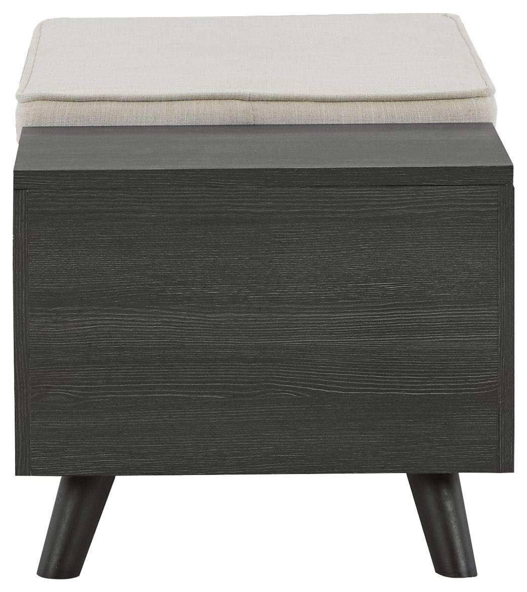 The clean profile of this small storage bench makes an entrance anywhere and everywhere you place it. Replicated blackened wood finish with a grayed textural grain and tapered wood legs lend a fresh flair. Adding form and function, both tops are removable to expose hidden storage underneath. A must-have piece for small spaces.