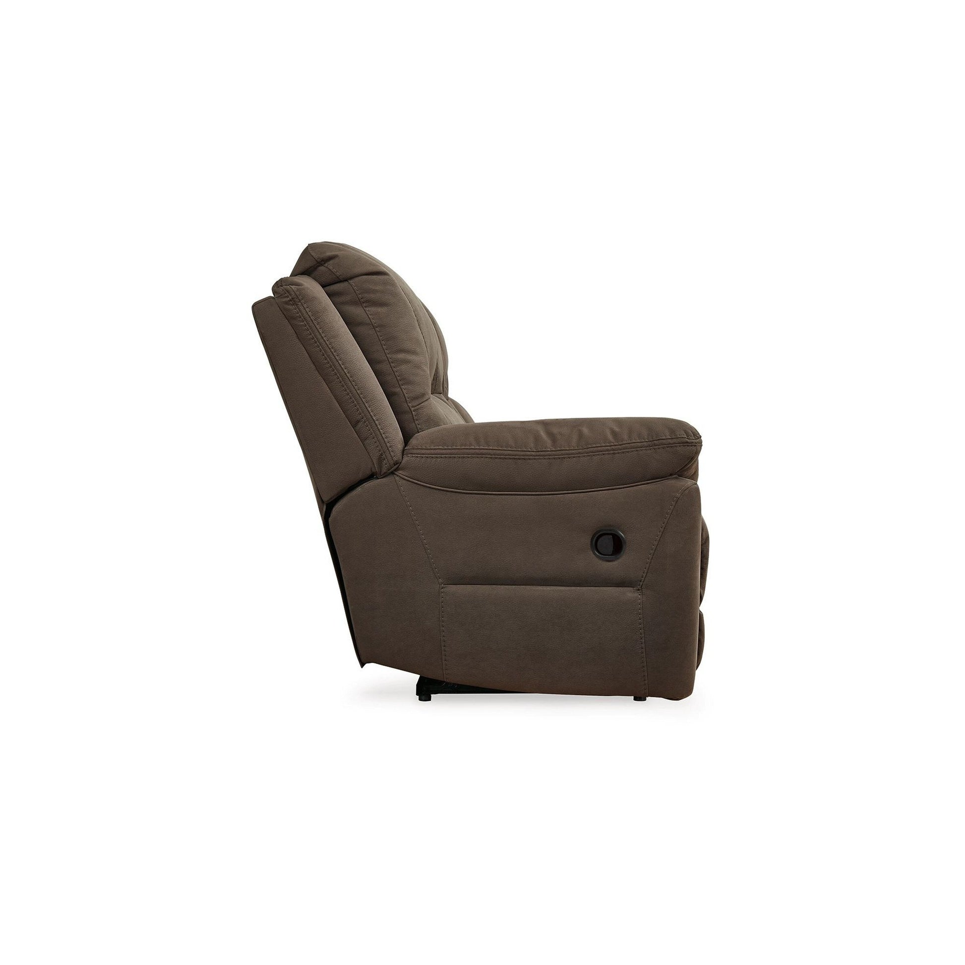 Enhance your lounging experience with this reclining sofa. Crafted from soft espresso brown faux suede, it features plush pillow-top arms, and a supportive bustle back. The smooth pull-tab reclining mechanism allows for easy adjustment. Its zero-wall design provides space-saving convenience, making it a perfect fit for any room. Check out our Zane collection for more.
