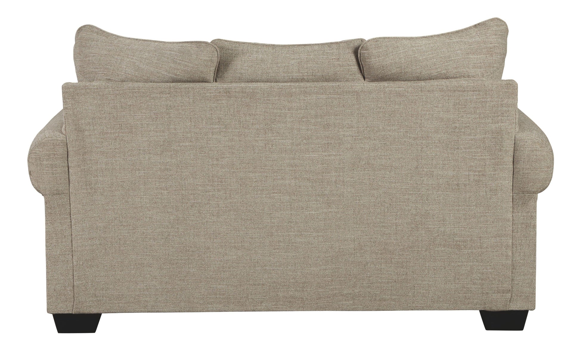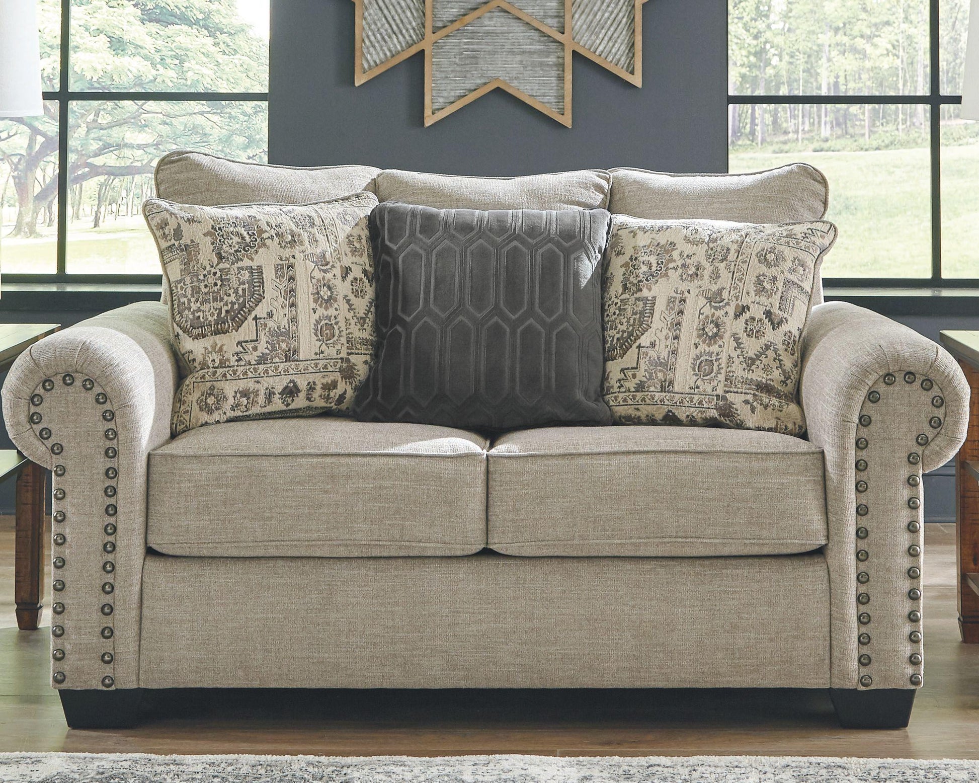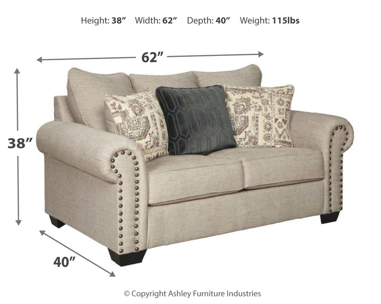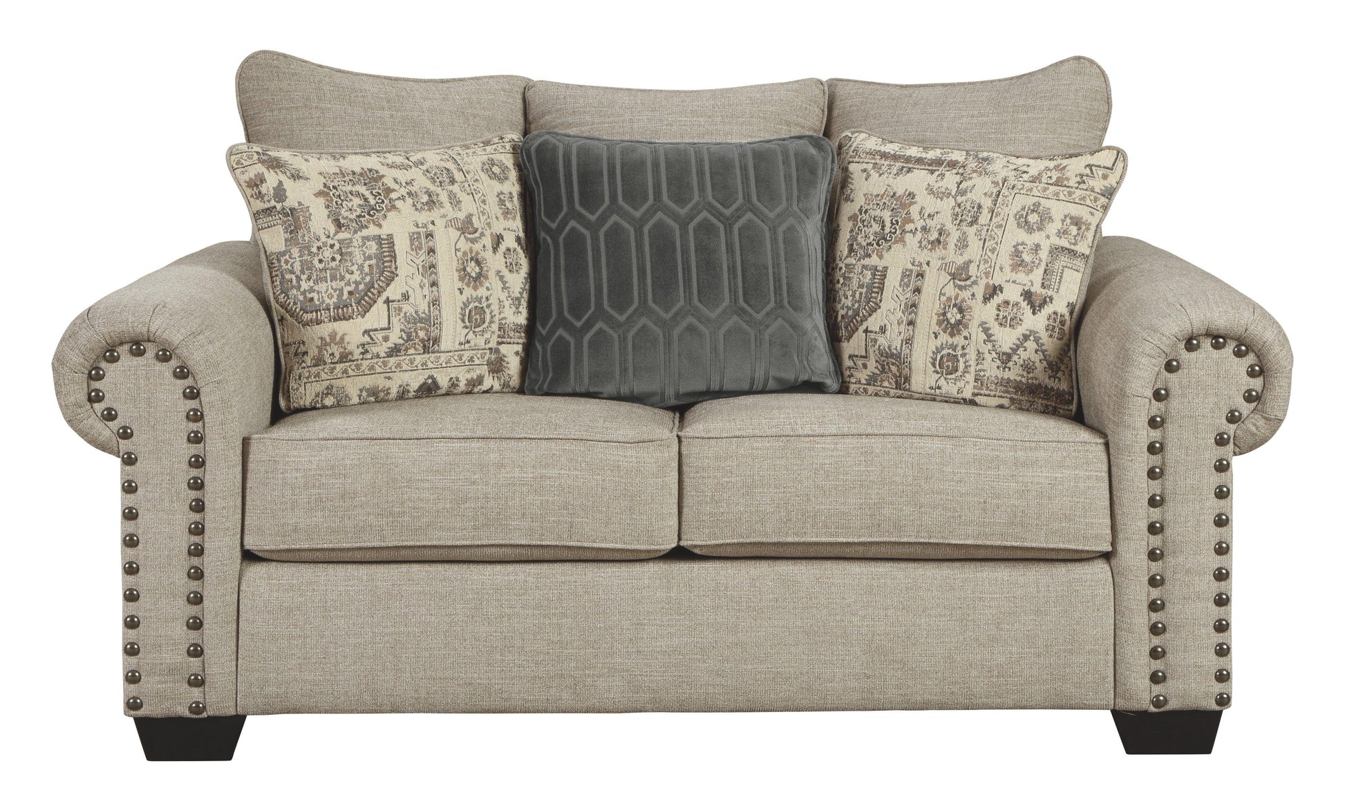 This loveseat lets you make a high-style statement at a comfortably affordable price. Richly traditional roll arms are given a modern punch care of oversized nailhead trim in a black nickel-tone finish. Linen-weave upholstery in fresh and clean sandstone beige is complemented with designer pillows that add texture and sophistication.