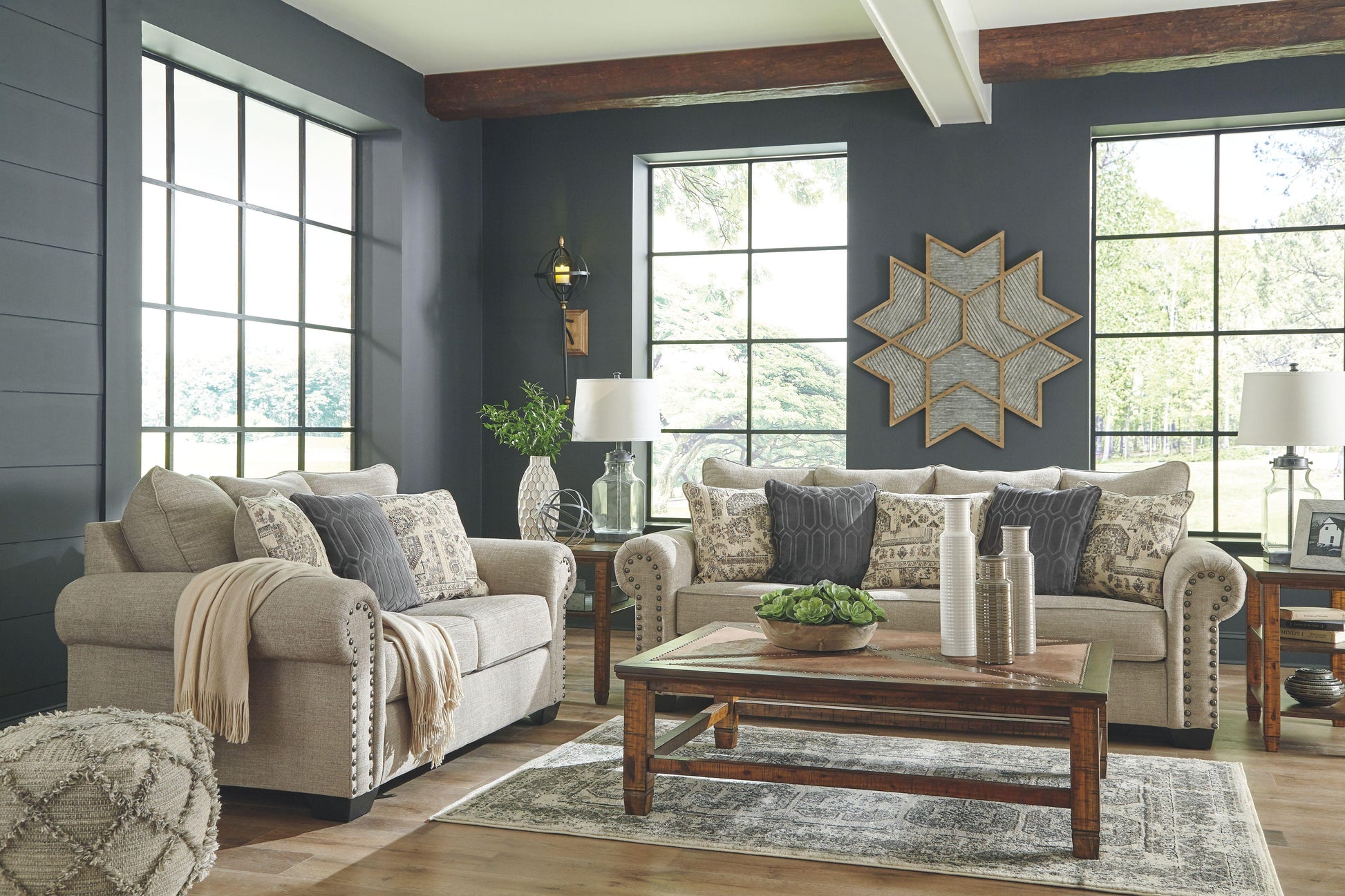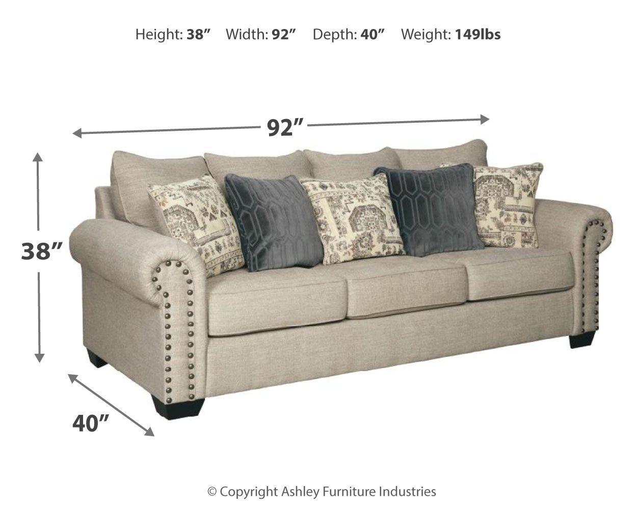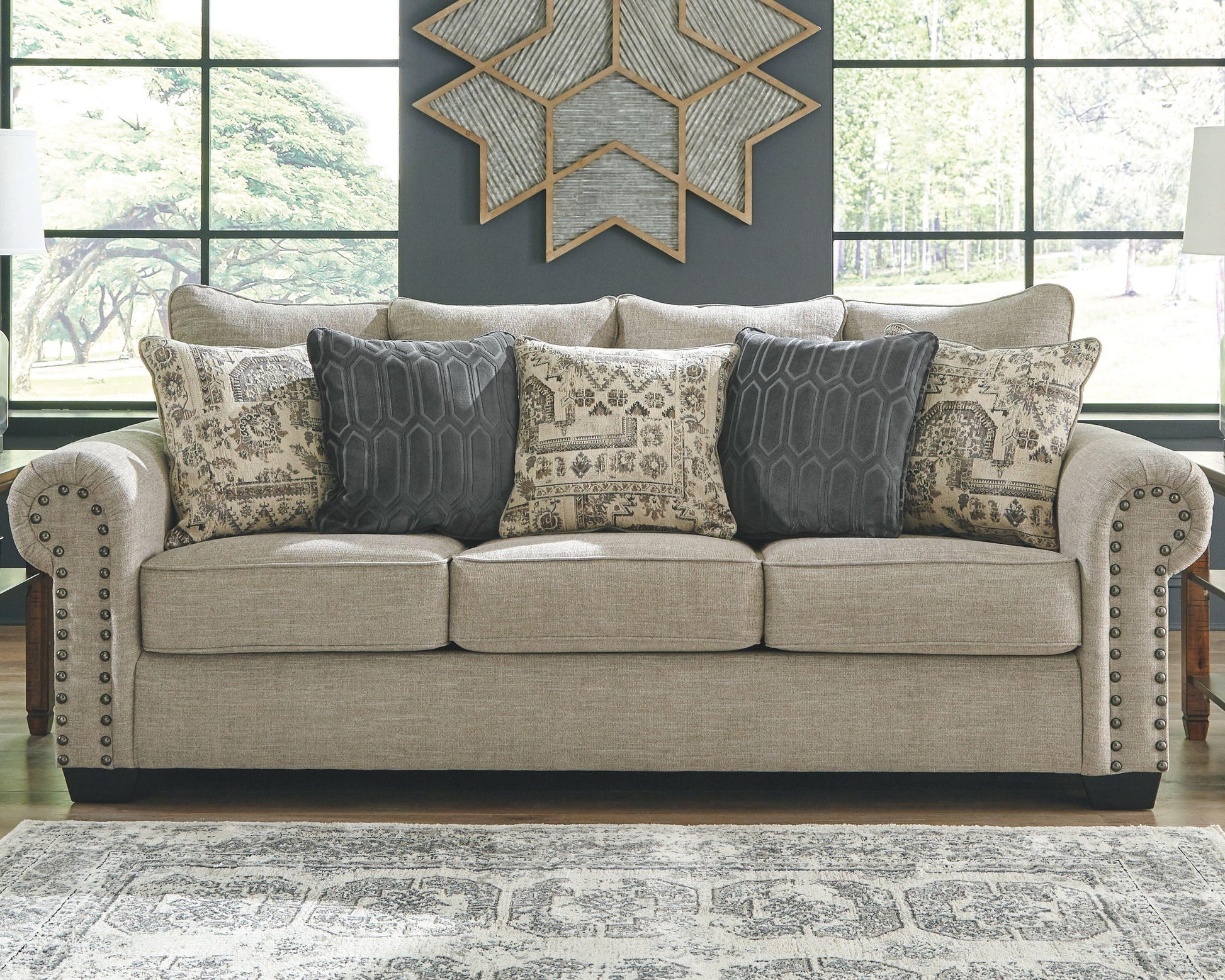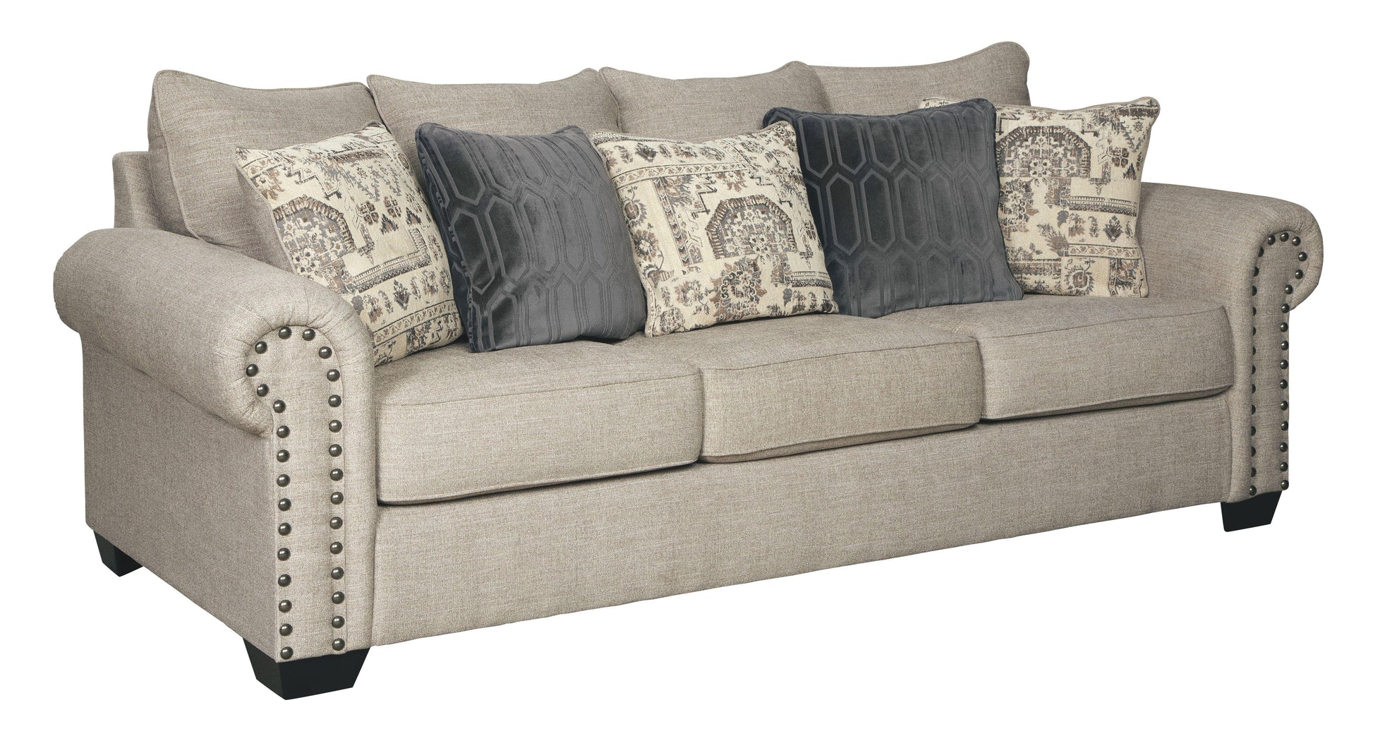 This sofa lets you make a high-style statement at a comfortably affordable price. Richly traditional roll arms are given a modern punch care of oversized nailhead trim in a black nickel-tone finish. Linen-weave upholstery in fresh and clean sandstone beige is complemented with textural pillows that are so plush to the touch.